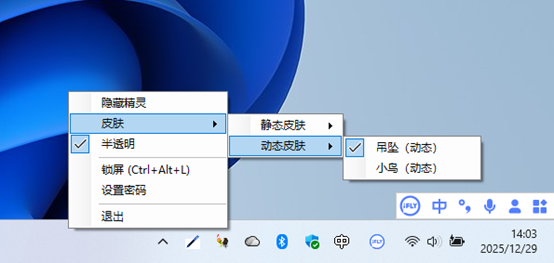 - 托盘菜单快捷操作:左键单击系统托盘图标即可显示/隐藏精灵,右键菜单提供完整功能入口。