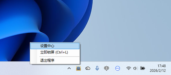 双击主程序 MathArtScreenLock.exe,出现系统托盘,右键菜单包含:设置中心、立即锁屏、退出。