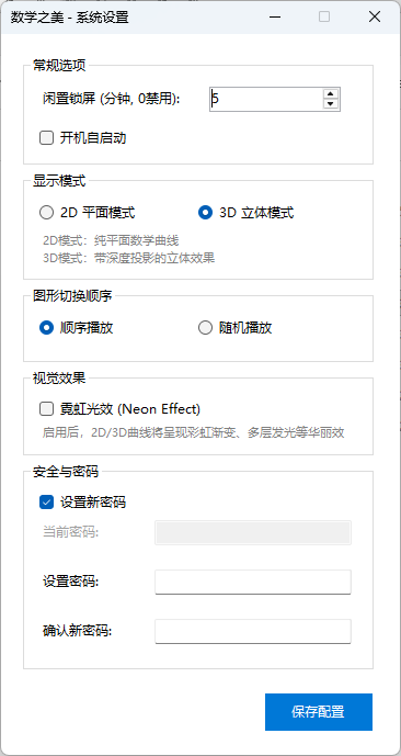 "数学之美锁屏精灵"是一款以数学曲线为主题的动态屏幕保护程序。它能够循环展示50多条精美的参数曲线,支持2D平面与3D立体两种显示模式,并可选霓虹光效获得彩虹渐变、多层发光等华丽视觉效果。程序内置闲置锁屏、密码保护、开机自启动等实用功能,为您的桌面增添科技与艺术气息。