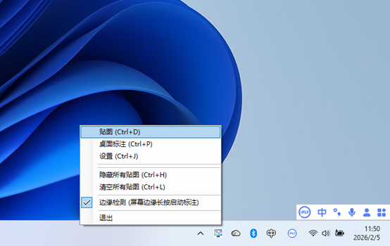 多截图支持:可同时打开多个贴图窗口,各自独立管理。系统托盘菜单中有菜单命令"显示/隐藏所有贴图(Ctrl+H)"和"清空所有贴图",用于快速隐藏/恢复显示/清空所有已打开的截图窗口。