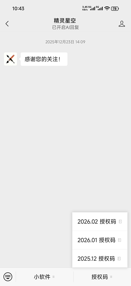 在公众号菜单中点击「授权码」。